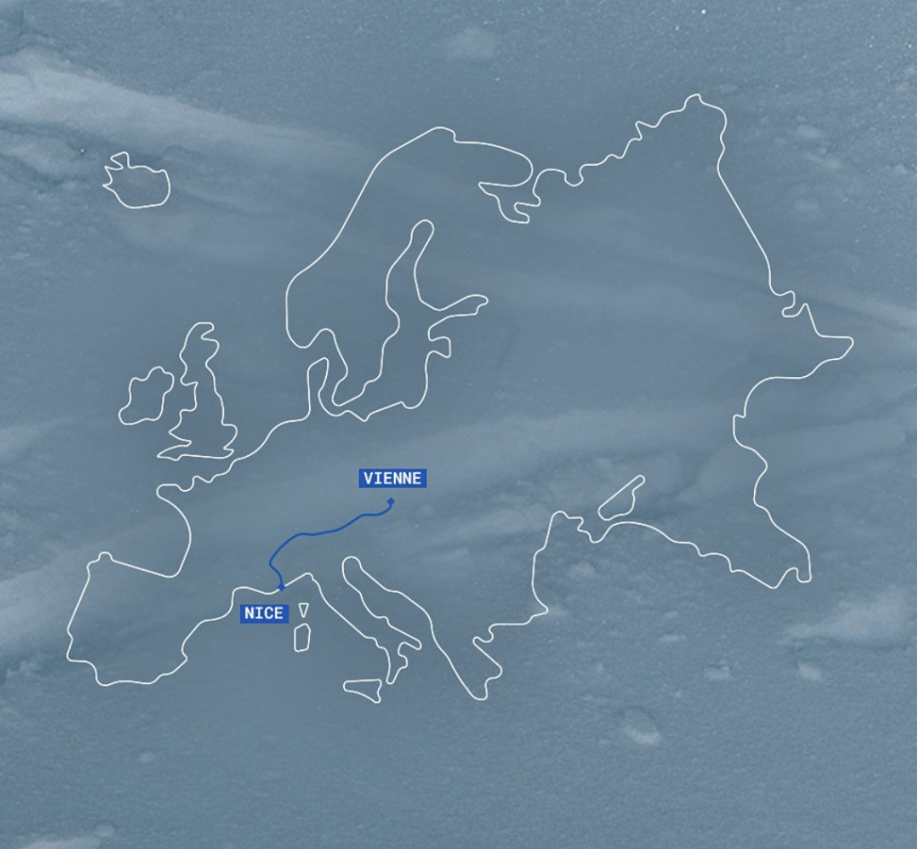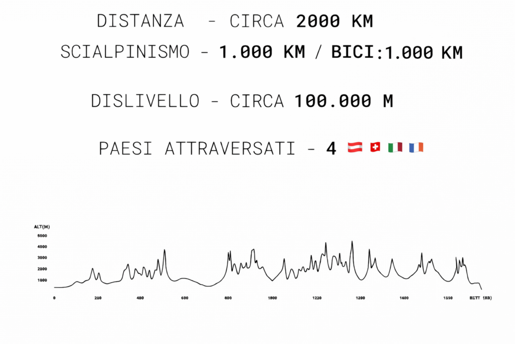 L’obiettivo è semplice da raccontare, molto meno da realizzare: attraversare integralmente l’arco alpino da Vienna a Nizza, muovendosi esclusivamente con sci d’alpinismo e bicicletta, senza mezzi motorizzati. Un itinerario che attraversa quattro Paesi: Austria, Svizzera, Italia e Francia, lungo circa 2.000 chilometri complessivi, con un dislivello positivo stimato attorno ai 100.000 metri. Una linea che attraversa il cuore delle Alpi e che tocca alcuni dei massicci più iconici del continente: dal Bernina al Monte Bianco, dal Gran Paradiso fino alle Alpi Marittime.